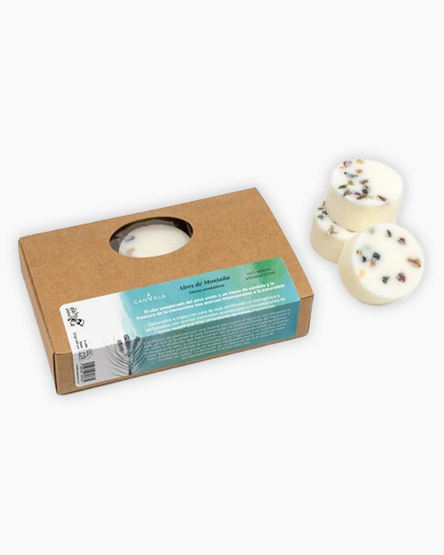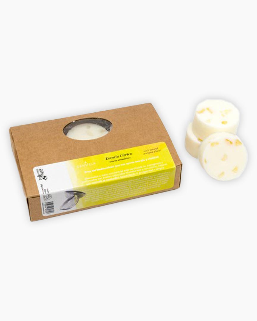 Els discos aromàtics de Canvela són discos elaborats amb cera de soja no transgènica i olis essencials 100% purs i ecològics. A cada disc aromàtic podem trobar petits minerals incrustats per a la seva decoració, però que també aporten interessants propietats.