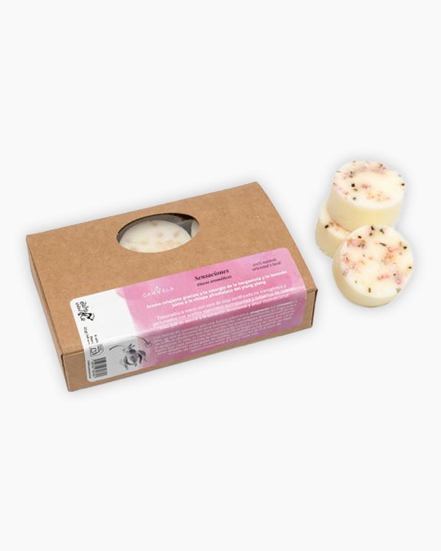 Ús: col·loca el disc en un difusor a espelma perquè es fongui amb l'escalfor i aromatitzi l'estança. Un cop el deixis refredar i se solidifiqui, pots tornar a utilitzar-lo en diverses ocasions fins que es consumeixi del tot. Si vols potenciar la seva aroma després de diversos usos, pots posar unes gotes del teu oli essencial preferit sobre la cera líquida servint com a substitut de l'aigua, evitant així l'escalfament excessiu i la pèrdua de propietats dels olis essencials.