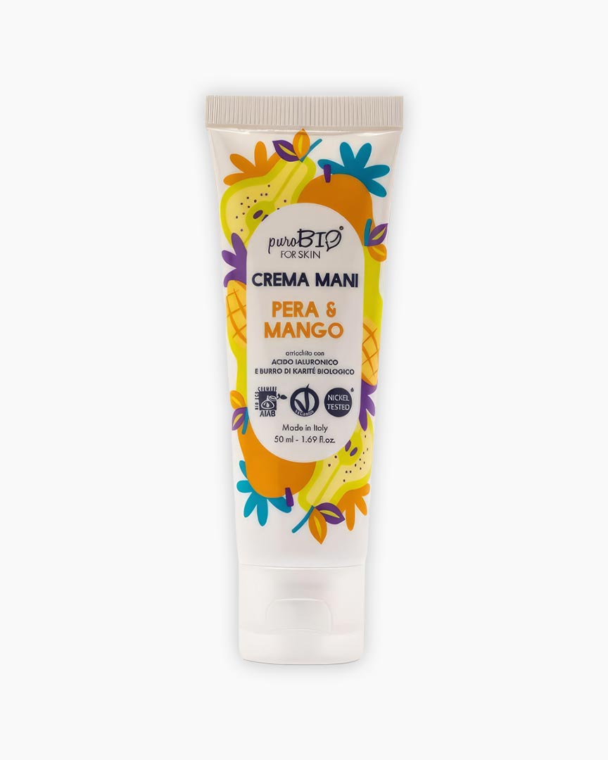 - Crema de mans de Pera i Mango (50 ml): formulada amb Àcid Hialurònic i mantega de Karité orgànica, que dòna una hidratació instantània amb una textura lleugera i gens greixosa.