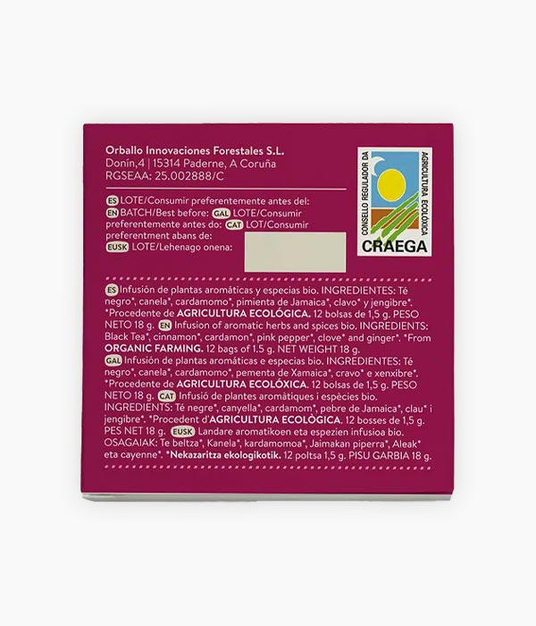 Té negro*, Pimienta de Jamaica*, Jengibre*, Canela*, Clavo* y Cardamomo*.